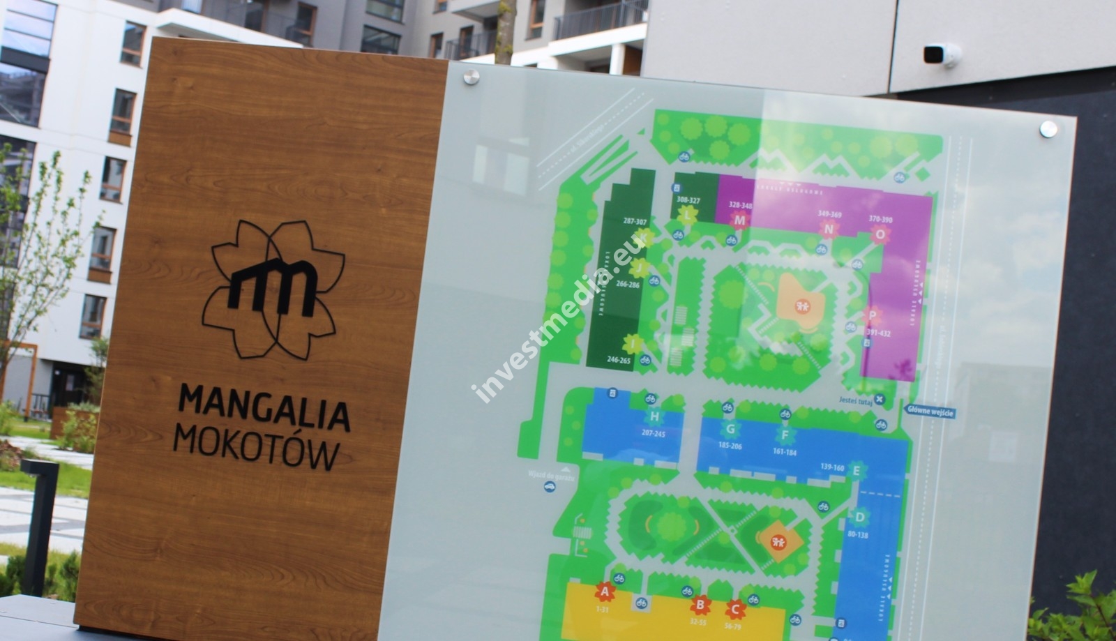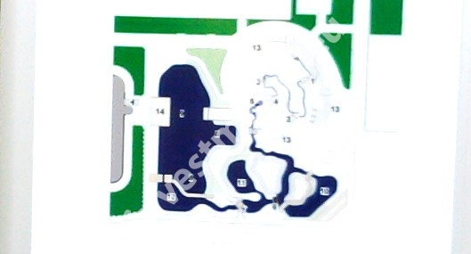 Residential buildings, access roads, staircase entrances, parking lots, garages, playgrounds, paths, any service points, and a legend.
