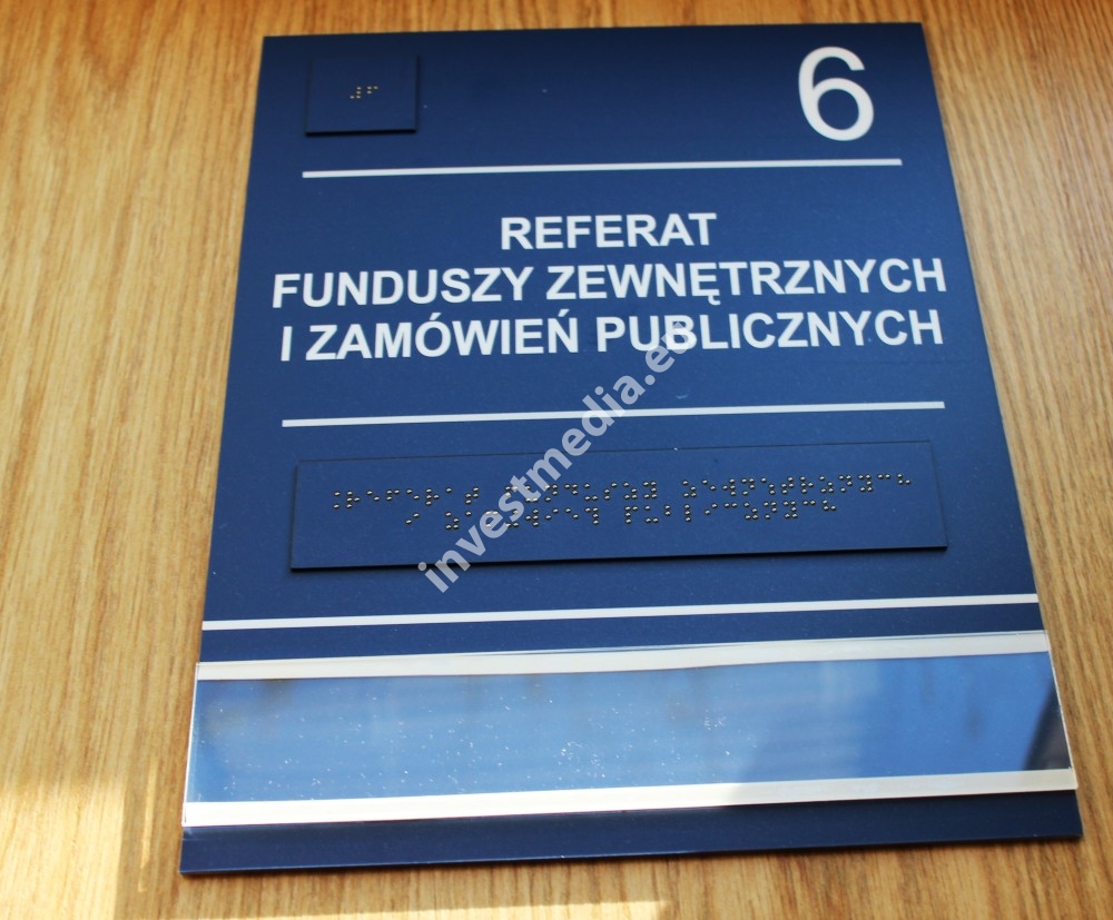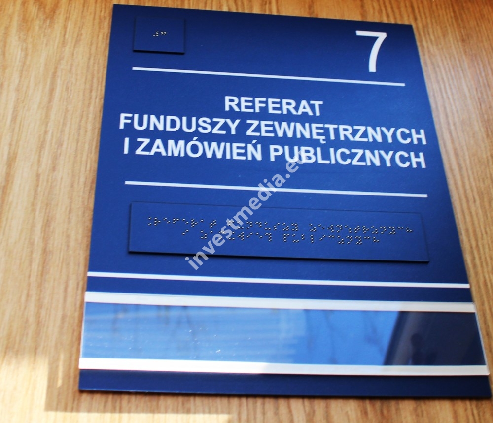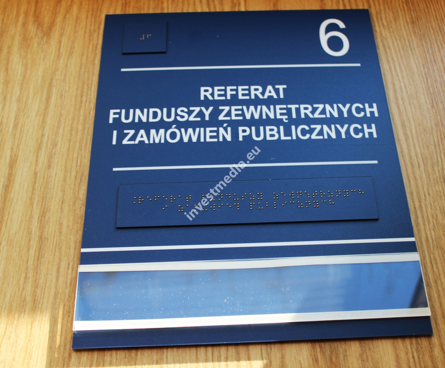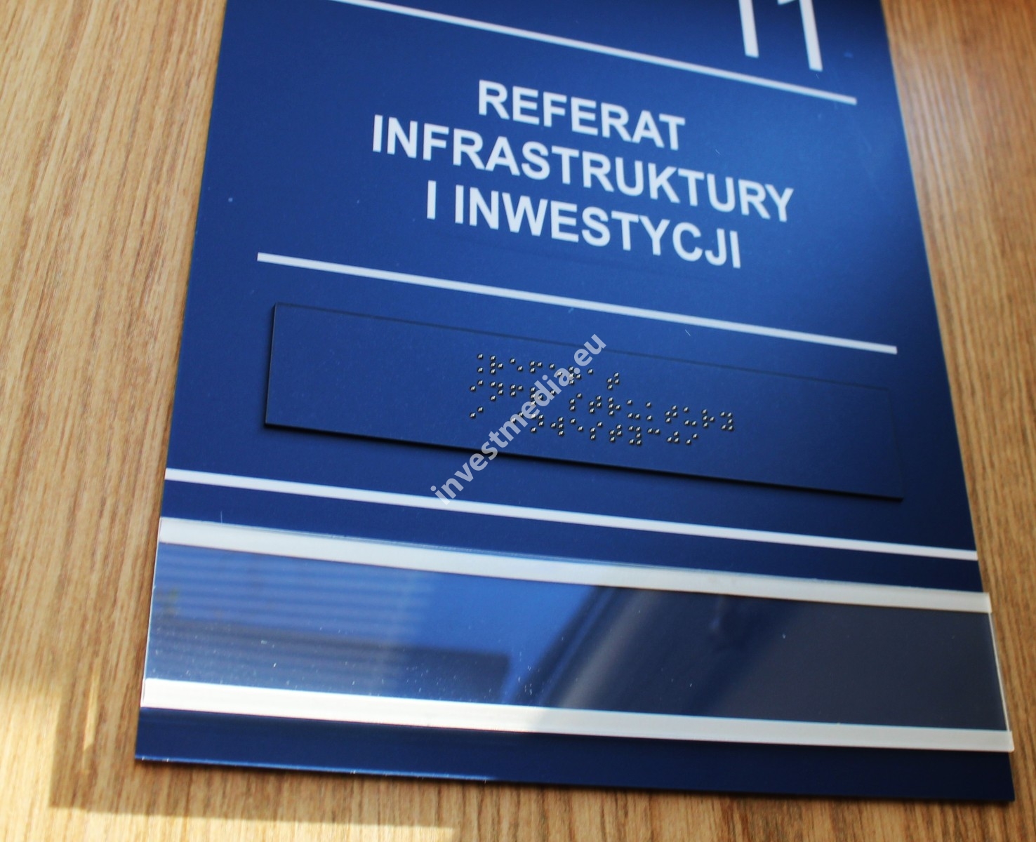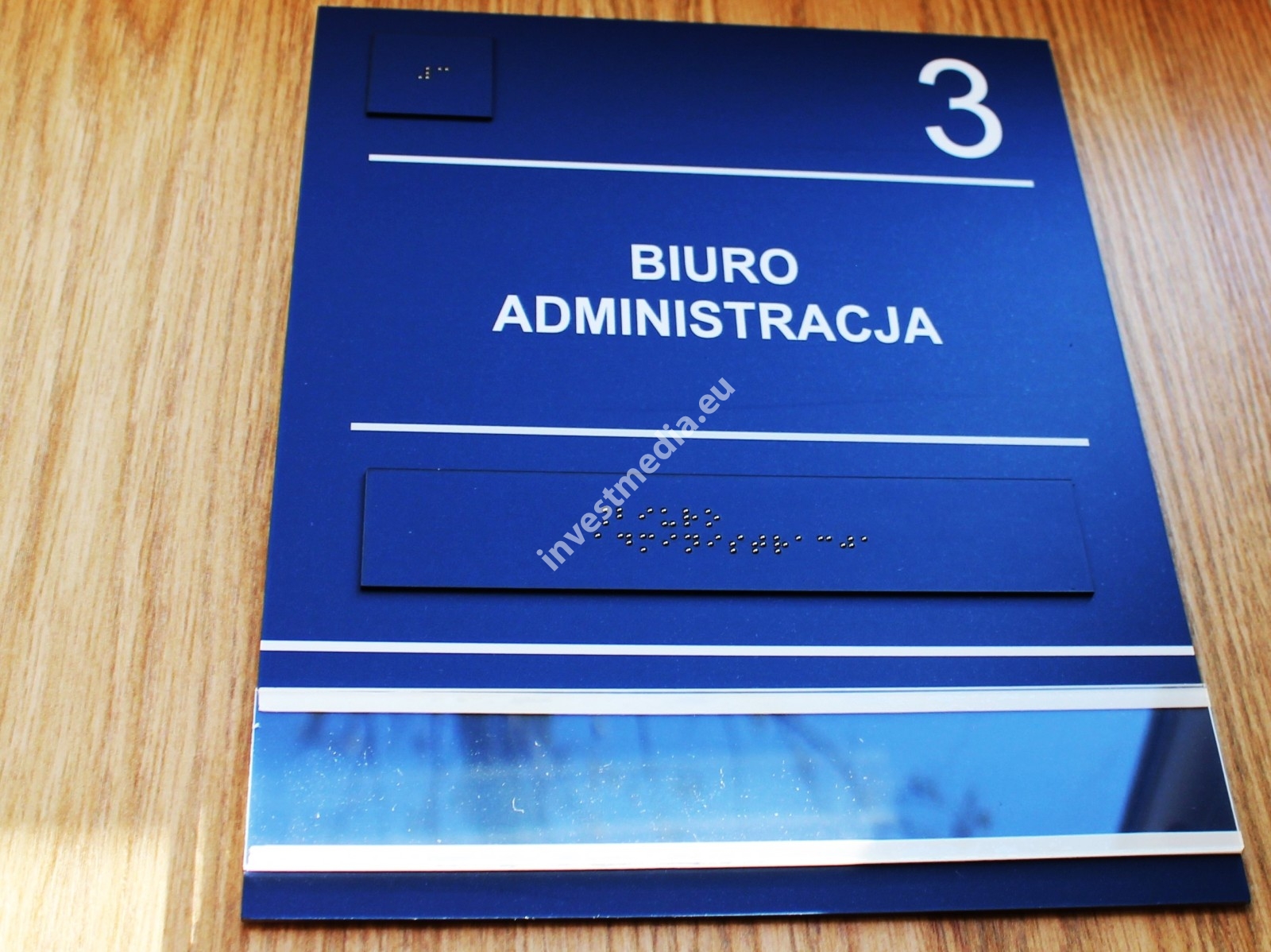 Napisy brajlowskie są zamocowane na wypukłych elementach tabliczki, co jeszcze bardziej ułatwia znalezienie informacji przez osobę z niepełnosprawnością wzroku.