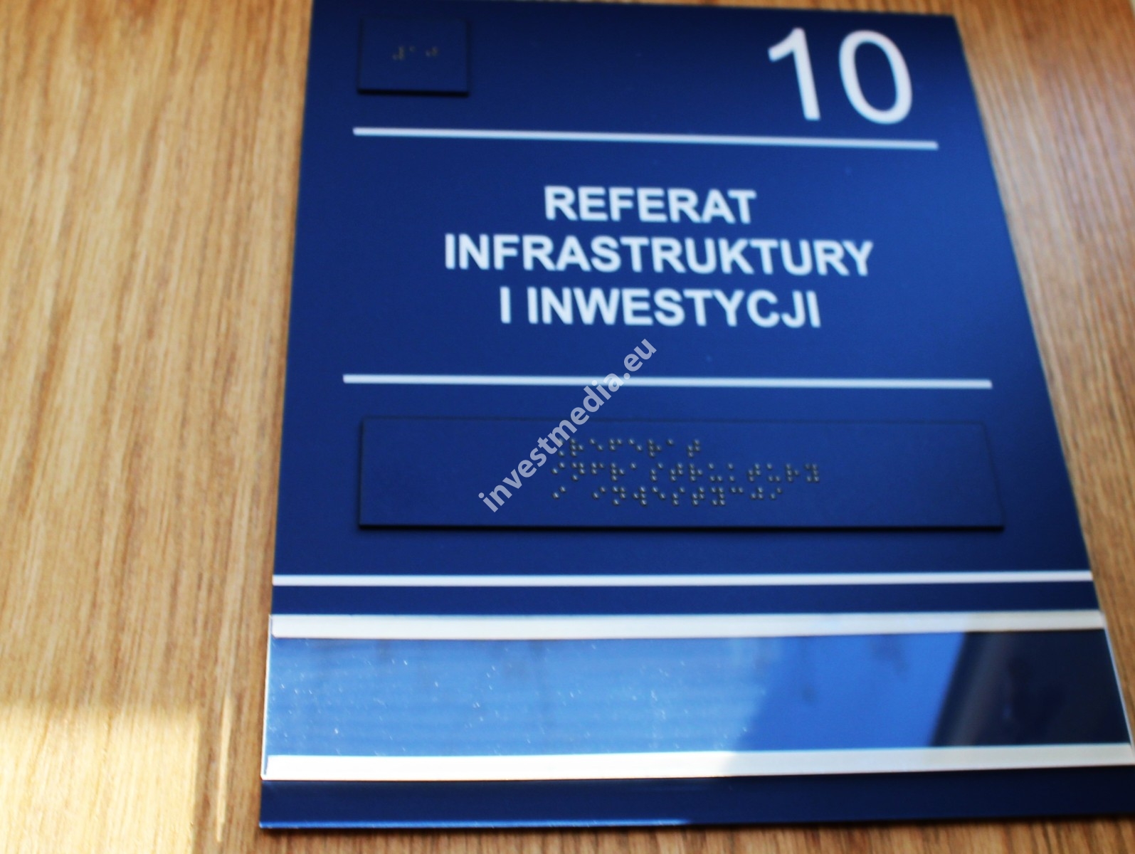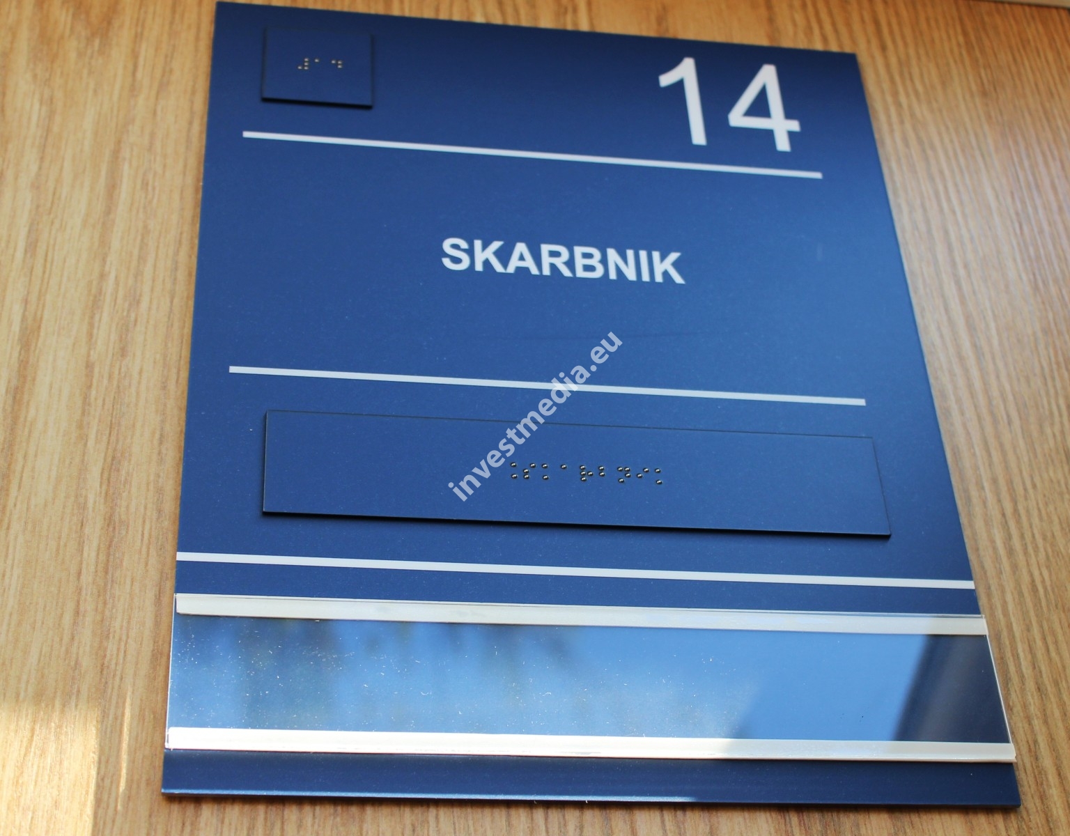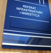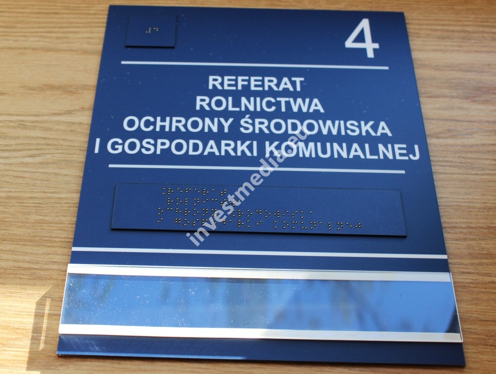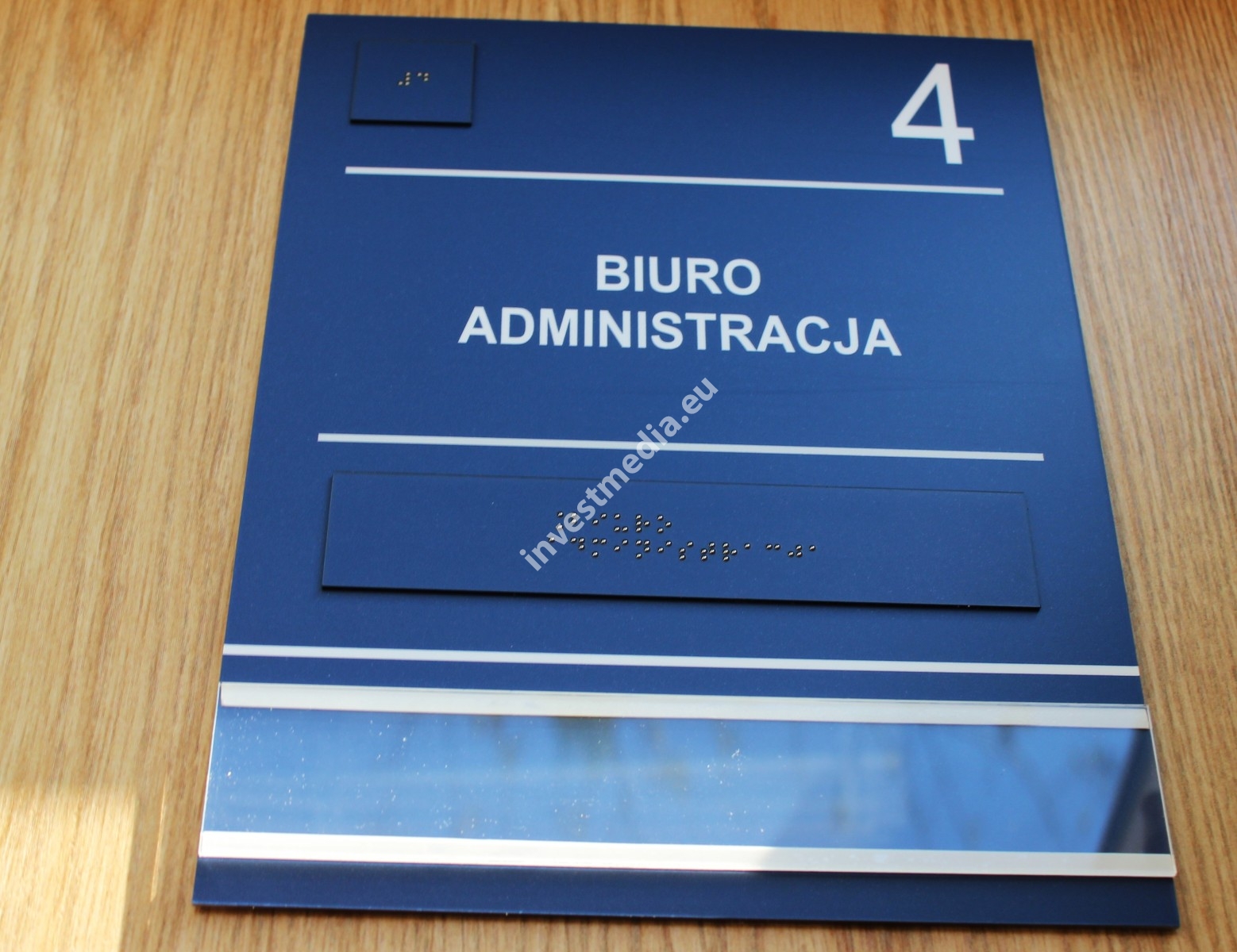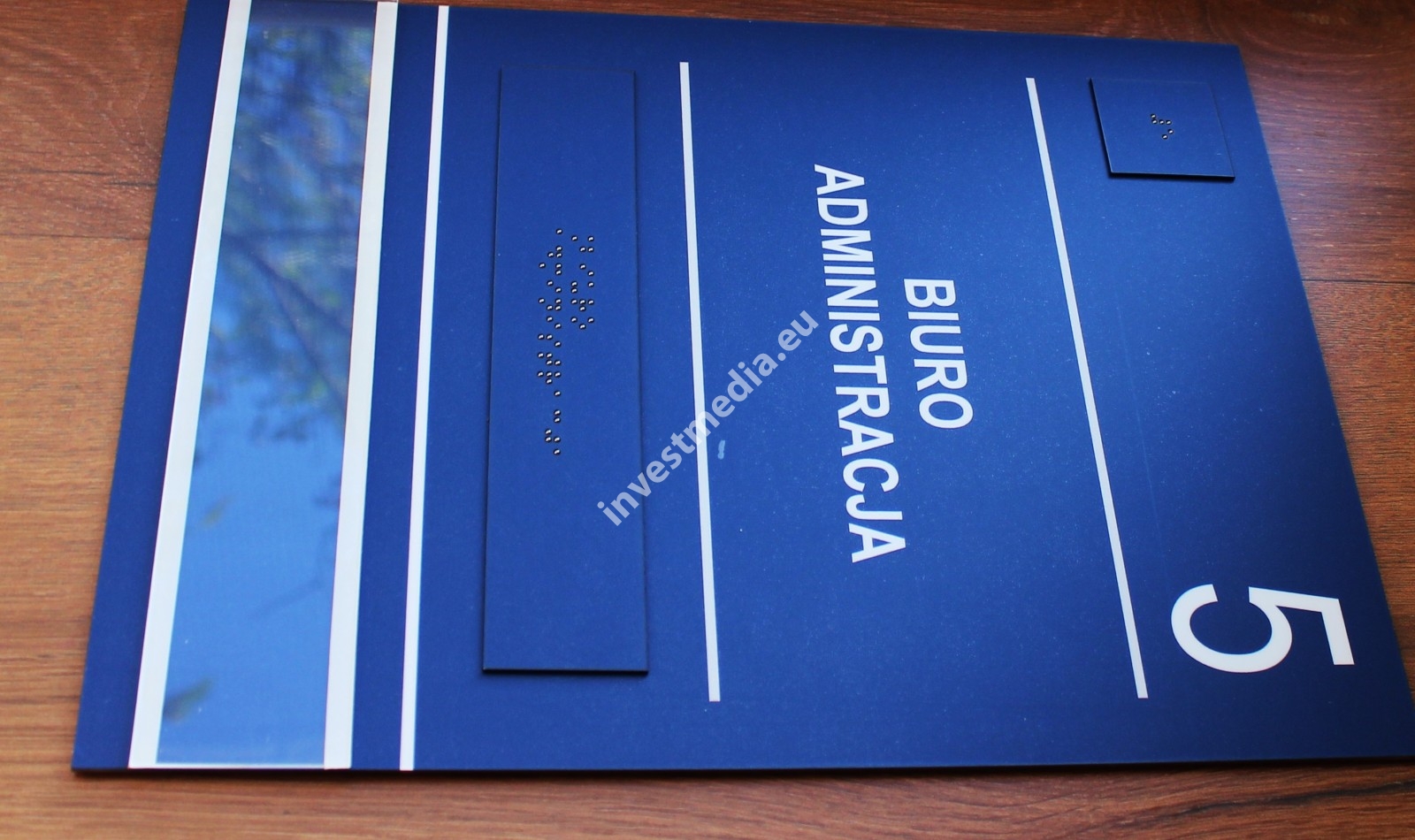 Napisy brajlowskie są zamocowane na wypukłych elementach tabliczki, co jeszcze bardziej ułatwia znalezienie informacji przez osobę z niepełnosprawnością wzroku.